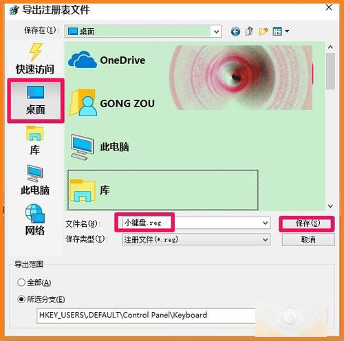 在打开的导出注册表文件窗口,我们点击:桌面,在文件名(N)栏输入:小键盘.reg,再点击:保存(目的是备份注册表文件,如果出现问题,恢复注册表文件就可以了);