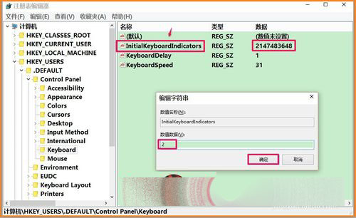 回到注册表编辑器窗口,我们左键双击:InitialKeyboardIndicators,在弹出的编辑字符串小窗口的数值数据(V)栏把数值从“2147483648”更改为“2”,再点击:保存,退出注册表编辑器。