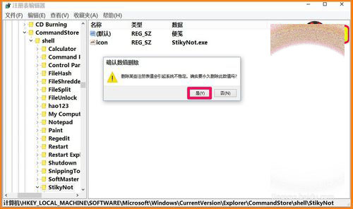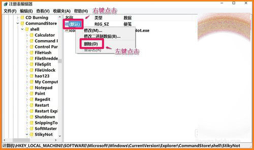 7、右键菜单“便笺”在注册表中的注册信息就被删除了,默认 REG_SZ 便笺更改为:默认 REG_SZ 数值未设置;