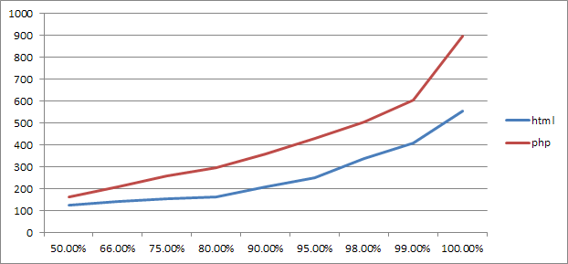 两者在90%以上的连接中,至少相差150ms。相对于复杂的php来说,html节约下来的运算量还是不少的。