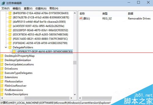 2、依次单击“编辑”“查找”,然后在弹出的查找对话框中的查找目标中输入“F5FB2C77-0E2F-4A16-A381-3E560C68BC83”,然后单击查找定位到HKEY_LOCAL_MACHINESOFTWAREMicrosoftWindowsCurrentVersionExplorerDesktopNameSpaceDelegateFolders{F5FB2C77-0E2F-4A16-A381-3E560C68BC83}