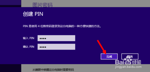 最后,在对话框中输入你的4位pin密码,点击“完成”。就大功告成了,以后就可以直接用这个pin密码登录了。没事就改改pin密码,再也不怕原始密码被人知道喽。
