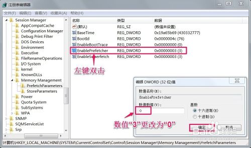 5、在PrefetchParameters对应的右侧窗口,找到:EnablePrefetcher,并左键双击:EnablePrefetcher; 在弹出的编辑 DWORD(32位)值窗口,把EnablePrefetcher的数值数据(V)从“3”更改为“0”,再点击:确定;