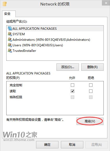 ▲在弹出的“权限”窗口中,点击下面的“高级”按钮