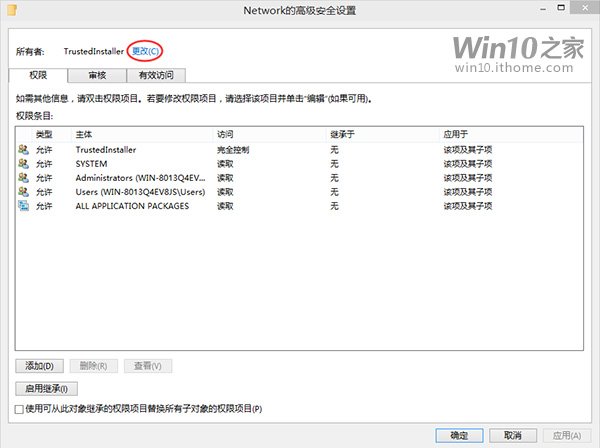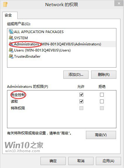 ▲点击“确定”关闭“Network高级安全设置”窗口后,在“安全”选项卡中选择“Administrators”(管理员)标签,确认“完全控制”被钩选,然后点击“确定”应用修改。