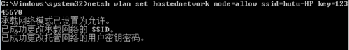 第二步,在cmd中输入“netsh wlan set hostednetwork ssid=计算机名 mode=allow key=设置密码。