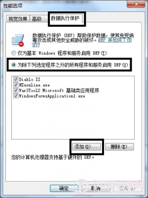 选择“数据执行保护”,选择“为除下列选定程序之外的所有程序和服务启用DEP(U)”,再点击下方的“添加”从硬盘中选中该程序即可。