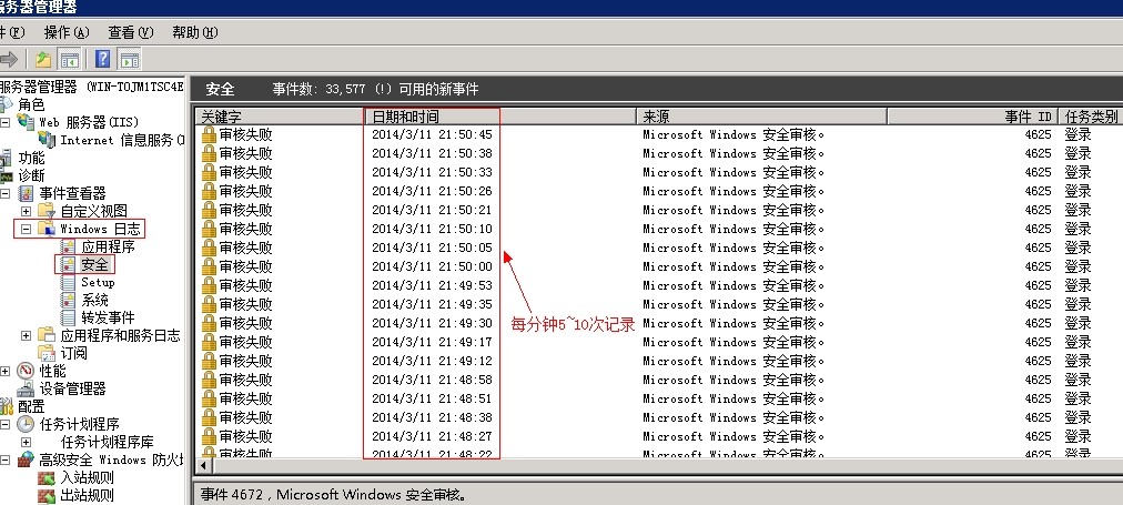 【现象】今天查看windows日志,在 -安全- 发现不断有消息刷出,显示 -审核失败- 事件ID为4624 的记录 每分钟大概刷新8条消息(如图)