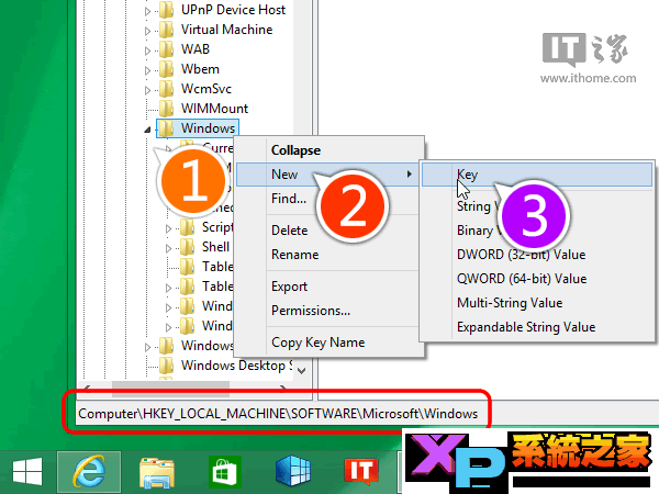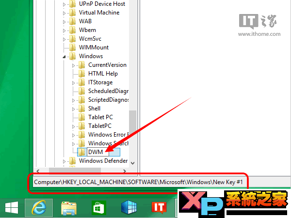 在左侧的 Windows 这儿点下鼠标右键,在右键菜单里面新建一个 Key,并命名为 DWM,如下图所示——