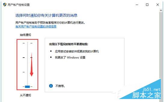 2、动动你的鼠标,滑动滑块往下拉,从不通知表示关闭 或者你只是不想桌面变暗,那么设置为从不通知上一档即可。