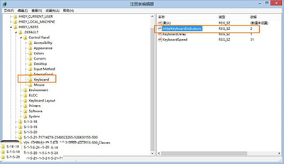 按“win+R”快捷键打开运行对话框,输入“regedit”命令,打开注册表编辑器,依次找到“HKEY_USERS→.DEFAULT→Control Panel→Keyboard”,将其右边的“InitialKeyboardIndicators”键值系统默认为2147483648修改为“2”,退出注册表编辑器,重新启动计算机,你就会发现数字小键盘的灯不再熄灭了。