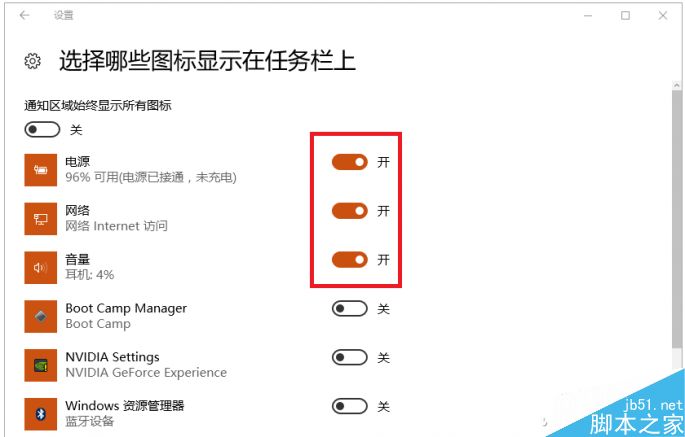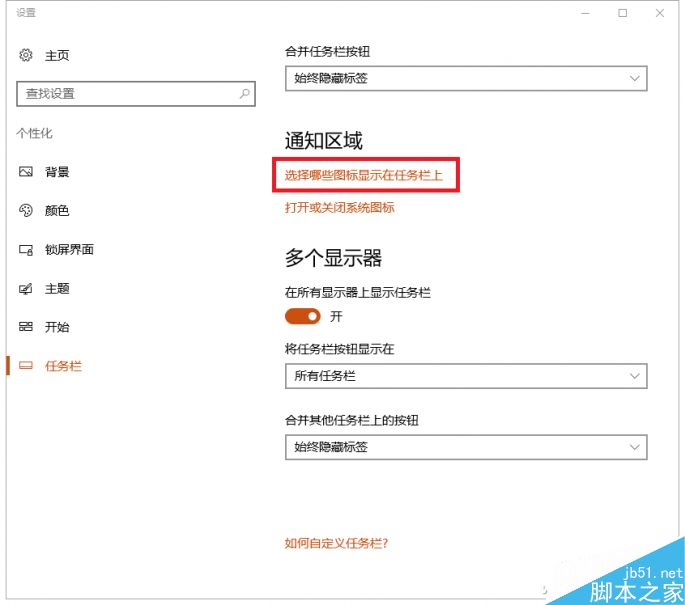 点击“选择哪些图标显示在任务栏上”后,使用后面的滑动开关,测试调整后会不会发生变化,如果此时操作没有任何反应的话,直接进入注册表吧!