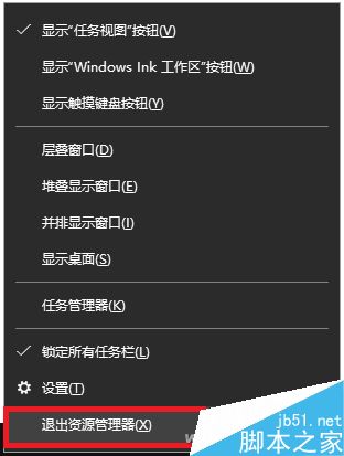然后按住Ctrl+Shift键,用鼠标右键点击任务栏,会出现新的“退出资源管理器”选项,选择它(或用任务管理器找到)Explorer.exe进程将其关闭)。