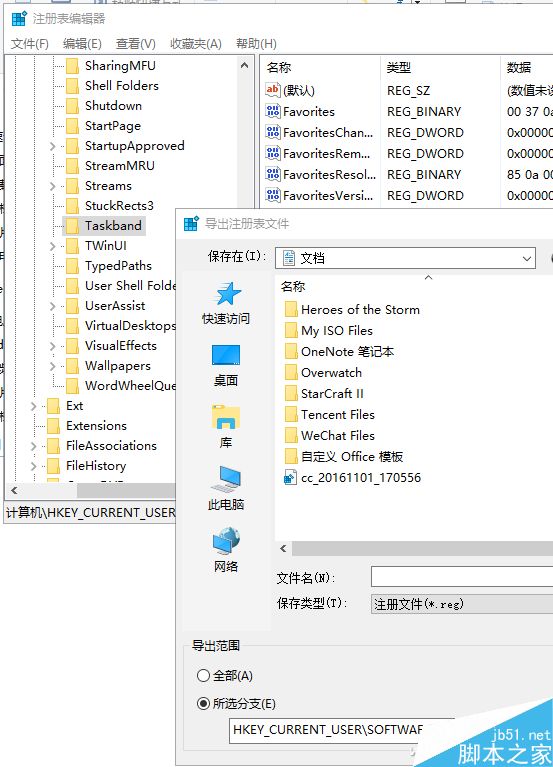 在左侧的“Taskband”上点击鼠标右键,选择“导出”,和图标保存在一起。备份任务栏的工作就算完成了(如果之前你曾参照我们的文章,为系统增加了功能,也可以按此步骤备份注册表相关项目,重装系统后就不用再折腾反复折腾注册表了)。