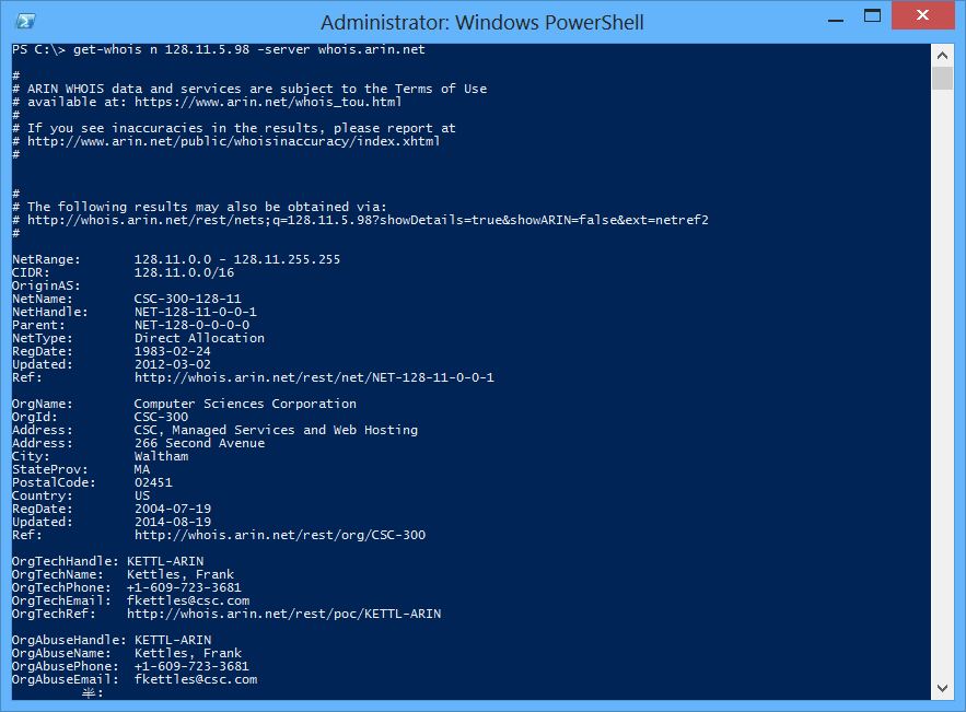 =====文件名:Get-whois.ps1===== function Get-WhoIs {<# Author:fuhj(powershell#live.cn ,http://fuhaijun.com) # Does a raw WHOIS query and returns the results#The simplest whois search#.Example#get-whois dnspod.com##This example is one that forwards to a second whois server ...#.Example#get-whois baidu.com -NoForward##Returns the partial results you get when you don"t follow forwarding to a new whois server#get-whois n 128.11.5.98 -server whois.arin.net##Does an ip lookup at arin.net#>[CmdletBinding()]param(# The query to send to WHOIS servers[Parameter(Position=0, ValueFromRemainingArguments=$true)][string]$query,# A specific whois server to search[string]$server,# Disable forwarding to new whois servers[switch]$NoForward)end {$TLDs = DATA { @{".com"= "whois.verisign-grs.com","whois.crsnic.net"".net"= "whois.verisign-grs.com","whois.crsnic.net"".org"= "whois.pir.org","whois.publicinterestregistry.net"".info"= "whois.afilias.info","whois.afilias.net"".biz"= "whois.neulevel.biz"".us"= "whois.nic.us"".uk"= "whois.nic.uk"".ca"= "whois.cira.ca"".tel"= "whois.nic.tel"".ie"= "whois.iedr.ie","whois.domainregistry.ie"".it"= "whois.nic.it"".li"= "whois.nic.li"".no"= "whois.norid.no"".cc"= "whois.nic.cc"".eu"= "whois.eu"".nu"= "whois.nic.nu"".au"= "whois.aunic.net","whois.ausregistry.net.au"".de"= "whois.denic.de"".ws"= "whois.worldsite.ws","whois.nic.ws","www.nic.ws"".sc"= "whois2.afilias-grs.net"".mobi" = "whois.dotmobiregistry.net"".pro"= "whois.registrypro.pro","whois.registry.pro"".edu"= "whois.educause.net","whois.crsnic.net"".tv"= "whois.nic.tv","tvwhois.verisign-grs.com"".travel"= "whois.nic.travel"".name" = "whois.nic.name"".in"= "whois.inregistry.net","whois.registry.in"".me"= "whois.nic.me","whois.meregistry.net"".at"= "whois.nic.at"".be"= "whois.dns.be"".cn"= "whois.cnnic.cn","whois.cnnic.net.cn"".edu.cn"="whois.edu.cn"".asia"= "whois.nic.asia"".ru"= "whois.ripn.ru","whois.ripn.net"".ro"= "whois.rotld.ro"".aero" = "whois.aero"".fr"= "whois.nic.fr"".se"= "whois.iis.se","whois.nic-se.se","whois.nic.se"".nl"= "whois.sidn.nl","whois.domain-registry.nl"".nz"= "whois.srs.net.nz","whois.domainz.net.nz"".mx"= "whois.nic.mx"".tw"= "whois.apnic.net","whois.twnic.net.tw"".ch"= "whois.nic.ch"".hk"= "whois.hknic.net.hk"".ac"= "whois.nic.ac"".ae"= "whois.nic.ae"".af"= "whois.nic.af"".ag"= "whois.nic.ag"".al"= "whois.ripe.net"".am"= "whois.amnic.net"".as"= "whois.nic.as"".az"= "whois.ripe.net"".ba"= "whois.ripe.net"".bg"= "whois.register.bg"".bi"= "whois.nic.bi"".bj"= "www.nic.bj"".br"= "whois.nic.br"".br.com"="whois.centralnic.net"".eu.org"="whois.eu.org"".bt"= "whois.netnames.net"".by"= "whois.ripe.net"".bz"= "whois.belizenic.bz"".cd"= "whois.nic.cd"".ck"= "whois.nic.ck"".cl"= "nic.cl"".coop"= "whois.nic.coop"".cx"= "whois.nic.cx"".cy"= "whois.ripe.net"".cz"= "whois.nic.cz"".dk"= "whois.dk-hostmaster.dk"".dm"= "whois.nic.cx"".dz"= "whois.ripe.net"".ee"= "whois.eenet.ee"".eg"= "whois.ripe.net"".es"= "whois.ripe.net"".fi"= "whois.ficora.fi"".fo"= "whois.ripe.net"".gb"= "whois.ripe.net"".ge"= "whois.ripe.net"".gl"= "whois.ripe.net"".gm"= "whois.ripe.net"".gov"= "whois.nic.gov"".gr"= "whois.ripe.net"".gs"= "whois.adamsnames.tc"".hm"= "whois.registry.hm"".hn"= "whois2.afilias-grs.net"".hr"= "whois.ripe.net"".hu"= "whois.ripe.net"".il"= "whois.isoc.org.il"".int"= "whois.isi.edu"".iq"= "vrx.net"".ir"= "whois.nic.ir"".is"= "whois.isnic.is"".je"= "whois.je"".jp"= "whois.jprs.jp"".kg"= "whois.domain.kg"".kr"= "whois.nic.or.kr"".la"= "whois2.afilias-grs.net"".lt"= "whois.domreg.lt"".lu"= "whois.restena.lu"".lv"= "whois.nic.lv"".ly"= "whois.lydomains.com"".ma"= "whois.iam.net.ma"".mc"= "whois.ripe.net"".md"= "whois.nic.md"".mil"= "whois.nic.mil"".mk"= "whois.ripe.net"".ms"= "whois.nic.ms"".mt"= "whois.ripe.net"".mu"= "whois.nic.mu"".my"= "whois.mynic.net.my"".nf"= "whois.nic.cx"".pl"= "whois.dns.pl"".pr"= "whois.nic.pr"".pt"= "whois.dns.pt"".sa"= "saudinic.net.sa"".sb"= "whois.nic.net.sb"".sg"= "whois.nic.net.sg"".sh"= "whois.nic.sh"".si"= "whois.arnes.si"".sk"= "whois.sk-nic.sk"".sm"= "whois.ripe.net"".st"= "whois.nic.st"".su"= "whois.ripn.net"".tc"= "whois.adamsnames.tc"".tf"= "whois.nic.tf"".th"= "whois.thnic.net"".tj"= "whois.nic.tj"".tk"= "whois.nic.tk"".tl"= "whois.domains.tl"".tm"= "whois.nic.tm"".tn"= "whois.ripe.net"".to"= "whois.tonic.to"".tp"= "whois.domains.tl"".tr"= "whois.nic.tr"".ua"= "whois.ripe.net"".uy"= "nic.uy"".uz"= "whois.cctld.uz"".va"= "whois.ripe.net"".vc"= "whois2.afilias-grs.net"".ve"= "whois.nic.ve"".vg"= "whois.adamsnames.tc"".yu"= "whois.ripe.net" }}$EAP, $ErrorActionPreference = $ErrorActionPreference, "Stop"$query = $query.Trim()if($query -match "(?:d{1,3}.){3}d{1,3}") {Write-Verbose "IP Lookup!"if($query -notmatch " ") {$query = "n $query"}if(!$server) { $server = "whois.arin.net" }} elseif(!$server) {$server = $TLDs.GetEnumerator() |Where { $query -like ("*"+$_.name) } |Select -Expand Value | Get-Random}if(!$server) { $server = "whois.arin.net" }$maxRequery = 3 do {Write-Verbose "Connecting to $server"$client = New-Object System.Net.Sockets.TcpClient $server, 43try {$stream = $client.GetStream()Write-Verbose "Sending Query: $query"$data = [System.Text.Encoding]::Ascii.GetBytes( $query + "`r`n" )$stream.Write($data, 0, $data.Length)Write-Verbose "Reading Response:"$reader = New-Object System.IO.StreamReader $stream, [System.Text.Encoding]::ASCII$result = $reader.ReadToEnd()if($result -match "(?s)Whois Server:s*(S+)s*") {Write-Warning "Recommended WHOIS server: ${server}"if(!$NoForward) {Write-verbose "Non-Authoritative Results:`n${result}"# cache, in case we can"t get an answer at the forwarderif(!$cachedResult) {$cachedResult = $result$cachedServer = $server}$server = $matches[1]$query = ($query -split " ")[-1]$maxRequery--} else { $maxRequery = 0 }} else { $maxRequery = 0 }} finally {if($stream) {$stream.Close()$stream.Dispose()}}} while ($maxRequery -gt 0)$resultif($cachedResult -and ($result -split "`n").count -lt 5) {Write-Warning "Original Result from ${cachedServer}:"$ca