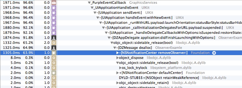 for (int i = 0 ; i < 10000; i++) {DZMessage* message = [DZMessage new];[[NSNotificationCenter defaultCenter] addObserver:self selector:@selector(handle) name:[@(i) stringValue] object:nil];}增加了多种消息类型之后,RemoveObserver占用了启动过程中63.9%的CPU消耗。