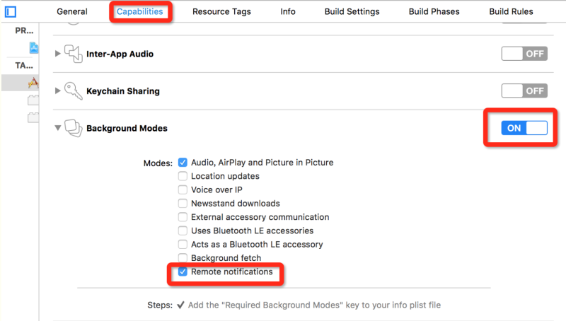 1 勾选Backgroud Modes -> Remote notifications,主要是iOS7之后,苹果支持后台运行,如果这里打开后,当接收到远程推送后,程序在后台也可以做一些处理,如下图所示: