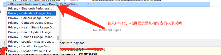 定位权限: Privacy - Location Always Usage Description 我们需要通过您的地理位置信息获取您周边的相关数据