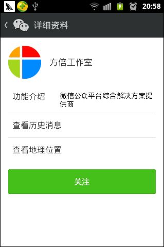 我们将使用微信公众账号方倍工作室作为讲解的例子,二维码见底部。