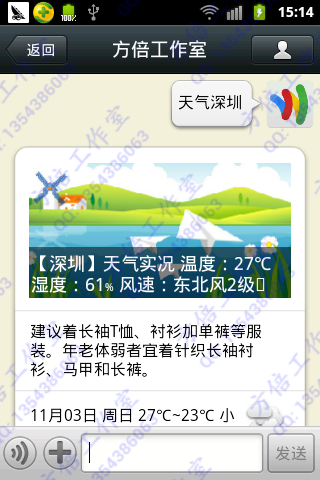 <Content><![CDATA[【深圳】天气实况 温度:27℃ 湿度:59% 风速:东北风3级