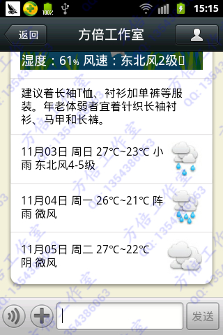 11月03日 周日 27℃~23℃ 小雨 东北风4-5级