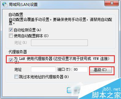 3.在弹出的“局域网(LAN)设置”对话框下,选中“为 LAN 使用代理服务器”的复选框。然后点击“高级”按钮。
