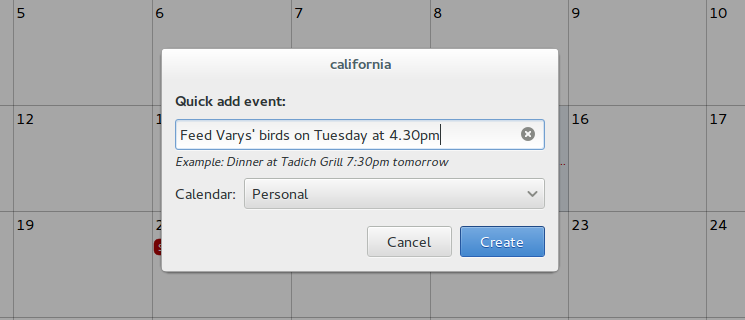 在下午2点就Nachos会见Sam”接着California就会自动把它安排下接下来的星期一的下午两点,而不必你手动输入位的信息(日期,时间等等)。(LCTT 译注:显然你只能输入英文才行)