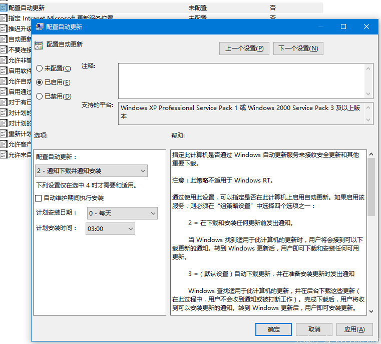 在右侧双击“配置自动更新”,然后选择“已启用”,在左下方下拉菜单中选择“2 - 通知下载并通知安装”后点击“确定”