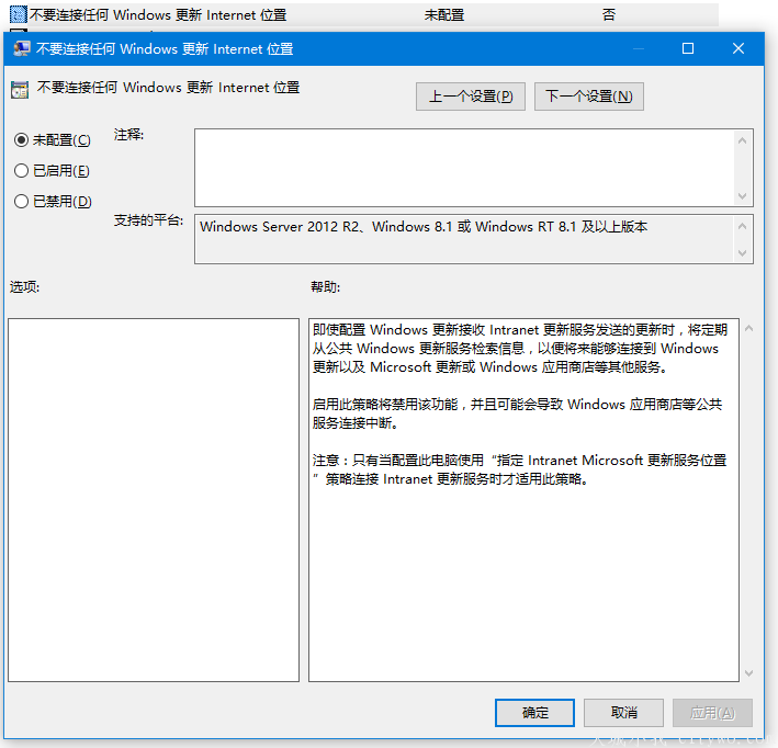 2.如果不想接受微软的更新,也可以选择“不要连接任何windows更新internet位置”,选择“已启用”,如果启用了此功能,那么系统将不会够连接到 Windows 更新以及 Microsoft 更新或 Windows 应用商店等其他服务,大家酌情使用。此外,win10家庭版的用户,可以使用“暴力”的方法,在“服务”中关掉“Windows Update”服务。但不建议这样做。