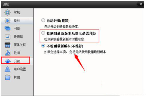 三、设置快播不升级 如果安装的是老版本的快播,建议到快播选项里面。设置一下,不检查最新版本。这样快播就不会再次检查升级了。