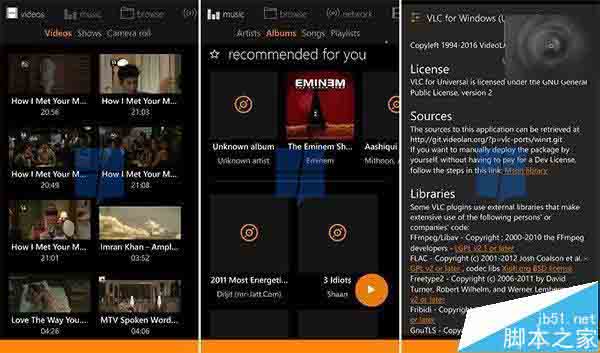Windows 10 Mobile版VLC视频播放器相比之前WP8.1版本,最大改变就是界面UI全面更新,核心功能升级,包括UPnP和浏览网络共享,支持HTTPS、自适应流媒体传输、更好的硬件解码,并且支持尽可能多的桌面解码。不过根据外媒消息,目前Win10 Mobile版VLC视频播放器还存在一些Bug,仍在封闭测试中,希望正式版尽快登陆Windows10应用商店。下面是Win10手机版VLC曝光截图:
