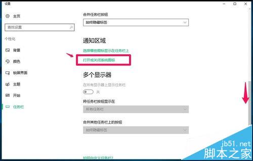 2、在打开的设置窗口,鼠标按住右侧的滑块向下拉,找到【通知区域】。点击【打开或关闭系统图标】;