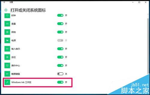 3、在打开或关闭系统图标设置窗口,我们看到Windows Ink工作区(Windows墨迹工作区)的开关处于【关】的位置,点击黑色小圆;