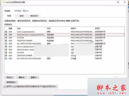 7、在UserData的高级安全设置,选择Administrators后,勾选 使用可从此对象继承的权限项目替换所有子对象的权限项目,点击 确定;