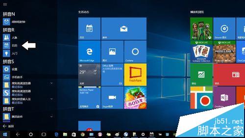 1、开始→点击上方的程序列表按钮→往下找到拼音(中文)R→日历。