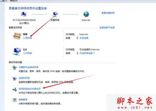 2、记住此处的网络类型,后面要用。选择“家庭组和共享设置”;