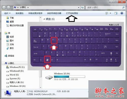 1)使用Windows+E快捷键,调出资源管理器→打开控制面板;