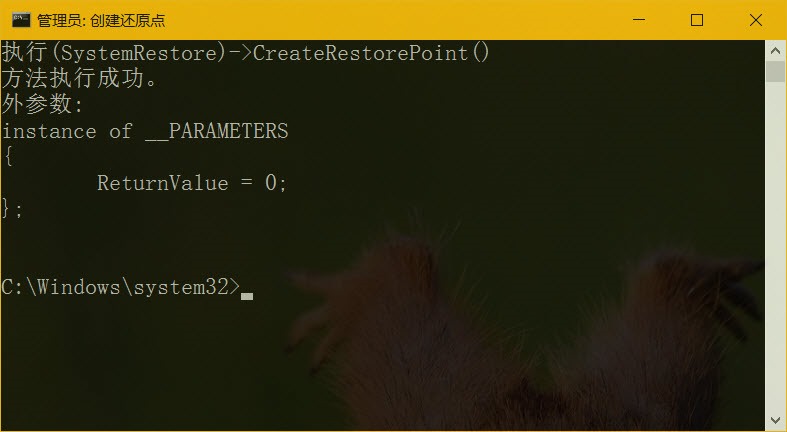 至此,创建 Windows 10 系统还原点的快捷方式就已经创建完成,大家可以双击进行测试。如果还原点可以正确创建,将看到如下图的输出。