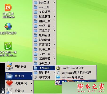 2、在PE中点击开始菜单,点击“程序”—“系统维护”—“系统引导自动修复”;