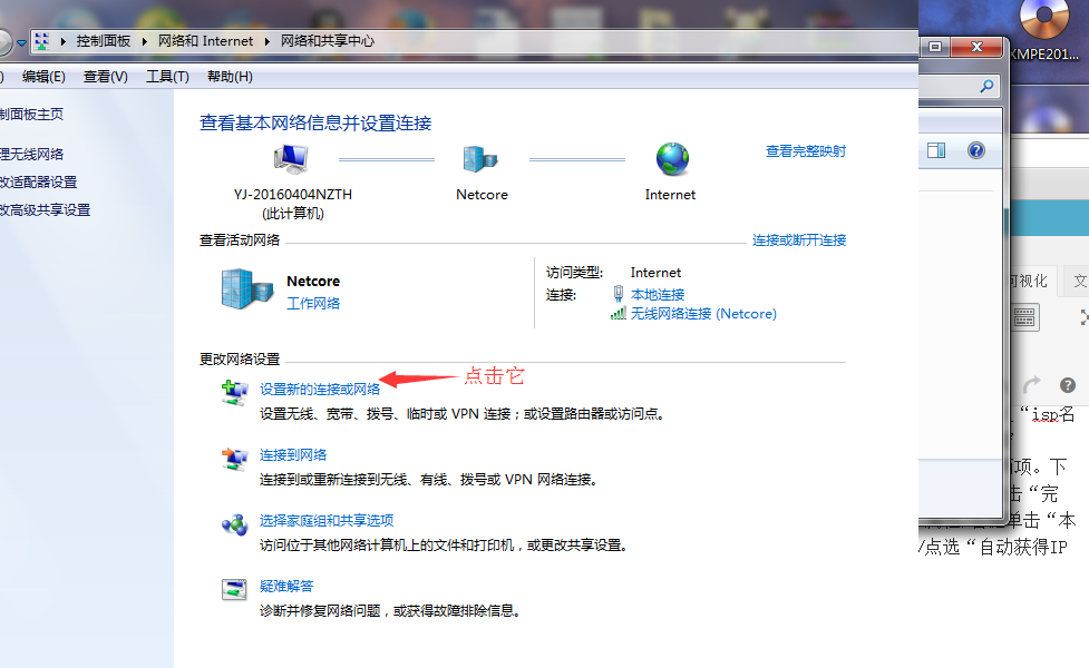 进入网络和共享中心之后,在中部,找到“设置新的连接和网络”,点击。