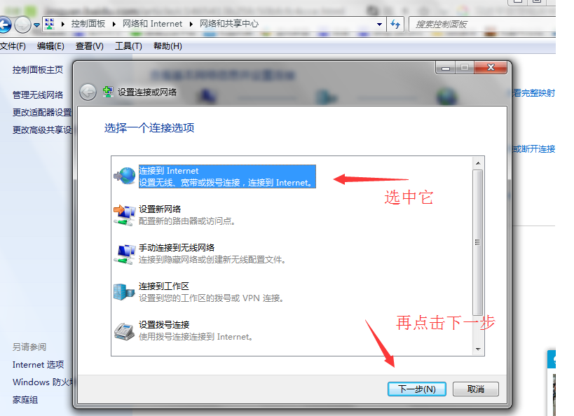 进入设置连接或网络窗口,选择第一项“连接到Internet”