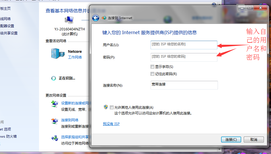 输入运营商提供给你的用户名和密码,勾选记住密码,设置宽带名称,点击连接。(连接名称可以随意修改)