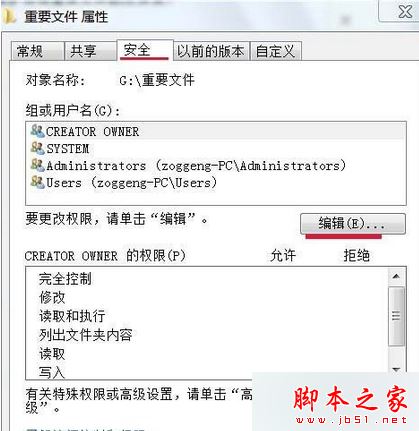 3、我们在弹出的重要文件属性窗口,点击:安全,接着点击:编辑 按钮;