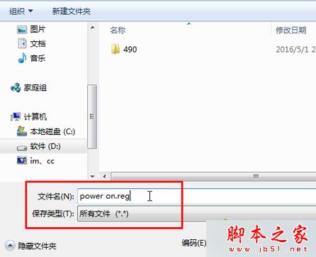 3、在“新建文本文档”左上角依次点击“文件”—“另存为”,在保存界面首先将“保存类型”下拉菜单中选择“所有文件”,然后将文件名修改为“power on.reg”点击保存;