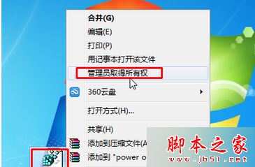4、在刚创建的“Power on.reg”文件上单击右键,选择“管理员取得所有权”;