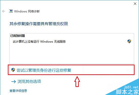 第三步、等待Windows网络诊断完成,之后就会看到诊断结果提示“此计算机上没有运行Windows无线服务”。这里点击“尝试以管理员身份进行这些修复”操作,如图。