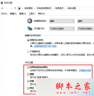 3、在下面关机设置中将“启用快速启动(推荐)”前面的勾去掉,点击保存修改即可。(如不能更改,请先点击“电源选项”上方的“更改不可用选项”;)