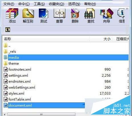 Word文件夹中,“document.xml”文件里面就是文本的内容,我们可以直接用记事本打开,但里面还有一些其他的代码;“media”文件夹里面就是文本中的图片了;(如下图)