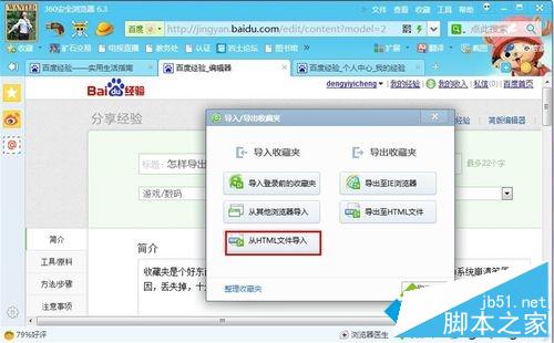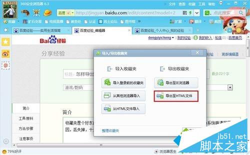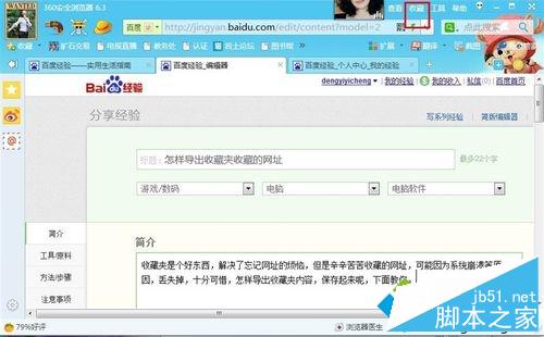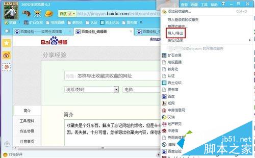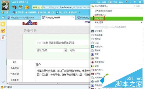 1、打开浏览器,点击“收藏”。并点击“导入/导出”;