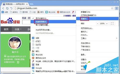2、用鼠标指着“收藏”,然后点击“收藏管理器”;